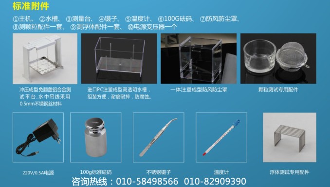 ①主機(jī)、②水槽、③測(cè)量臺(tái)、④鑷子、⑤溫度計(jì)、⑥砝碼、⑦防風(fēng)防塵罩、⑧測(cè)顆粒配件一套、⑨測(cè)浮體配件一套、⑩電源變壓器一個(gè)