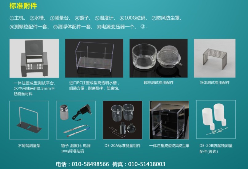 主機一臺、鑷子一支、溫度計一支、砝碼一個、防風(fēng)防塵罩一套、固體水槽一個、固體測量臺一件、測顆粒裝置一套、測浮體配件一套、液體測量放置板一塊、液體測量支架一個、DE-20A標(biāo)準(zhǔn)液體測量組件一套、電源變壓器一個