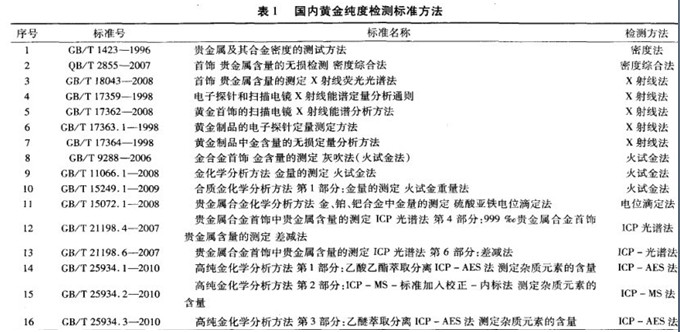 為了保證首飾的硬度、光澤度及美觀程度等,黃金首飾的組成原料不是單一的純金屬,而是以黃金為主要材料的合金體。目前,中國首飾行業(yè)強制性標(biāo)準08 11887-2008規(guī)定,黃金首飾按黃金純度大致可分為9K、14K、18K、22K、足金和千足金等幾種。對于各類首飾中金和其他組成元素的分析測試,目前國內(nèi)均有相應(yīng)的標(biāo)準分析方法,主要包括國家標(biāo)準、行業(yè)標(biāo)準、地方標(biāo)準等。這些分析方法為黃金首飾的公平交易以及相關(guān)部門的質(zhì)量監(jiān)督,提供了必要的技術(shù)支持。按照分析測試方法的原理和性質(zhì),可將這些方法大致劃分為密度法、X射線法、火試金法、重量法、電感耦合等離子體原子發(fā)射光譜法等。