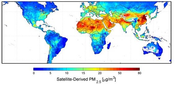 世界衛(wèi)生組織建議每立方米呼吸的空氣中,PM-2.5顆粒不大于10微克。2010年6月加拿大學(xué)者Aaron vanDonkelaar 和Randall Martin利用NASA的衛(wèi)星信息,采用計(jì)算機(jī)模型繪制了全球的PM-2.5分布圖(2001-2006年的平均值)。雖然衛(wèi)星探測(cè)技術(shù)無法準(zhǔn)確監(jiān)測(cè),存在很多監(jiān)測(cè)難題,例如無法很好的識(shí)別PM-2.5的近地濃度和高空濃度,云層的吸收,地面狀態(tài)(明亮的部分,如海洋,沙漠,城市)對(duì)測(cè)量的影響。但是,在這幅監(jiān)測(cè)圖上,仍然可以發(fā)現(xiàn)超過80%的世界人口呼吸著污染的空氣。由此可見,PM-2.5的地面監(jiān)測(cè)聯(lián)網(wǎng)對(duì)于人類的健康勢(shì)在必行。